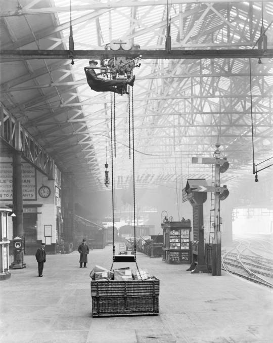 Another picture of the Telpher in operation. Noel Coates notes that it was an invention of Aspinwall, in 1899, to allow the rapid collection and distribution of parcels to waiting trains across the station. … At periodic intervals along its path, loading gauges were provided to allow the operator to judge if he would clear carriage roofs. (c) National Railway Museum. [10]