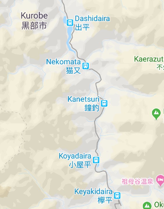 Tunnels and bridges follow, a Power Station is passed and trains eventually arrive at Keyakidaira Station, beyond which lies the Kurobegawa Daisan Power Station, the Shinkurobegawa Daisan Power Station and the Kurobe Senyō Railway which is in private hands. [18] Both of the branches of the private railway provide access to power stations further along the Gorge.
