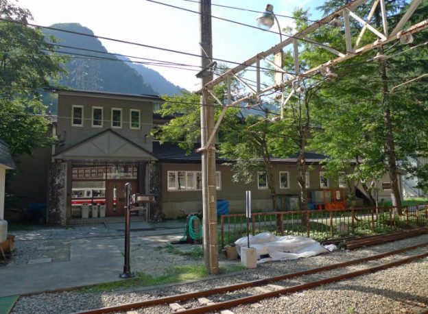 Trains do not emerge from that tunnel until well south of the Dam alongside Lake Unazuki and close to one of the power stations in the Gorge – Shin-Yanagawara Power Plant. This hydroelectric power station resembles an ancient European castle and is located on the shores of Lake Unazuki. [1]