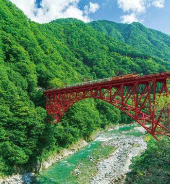 The first of these is the Okukane Bridge , a vermillion-lacquered bridge spanning the main course of the Kurobe River. The view enjoyed from this 34-meter-high bridge is breathtaking. The second is the Meiken Bridge.