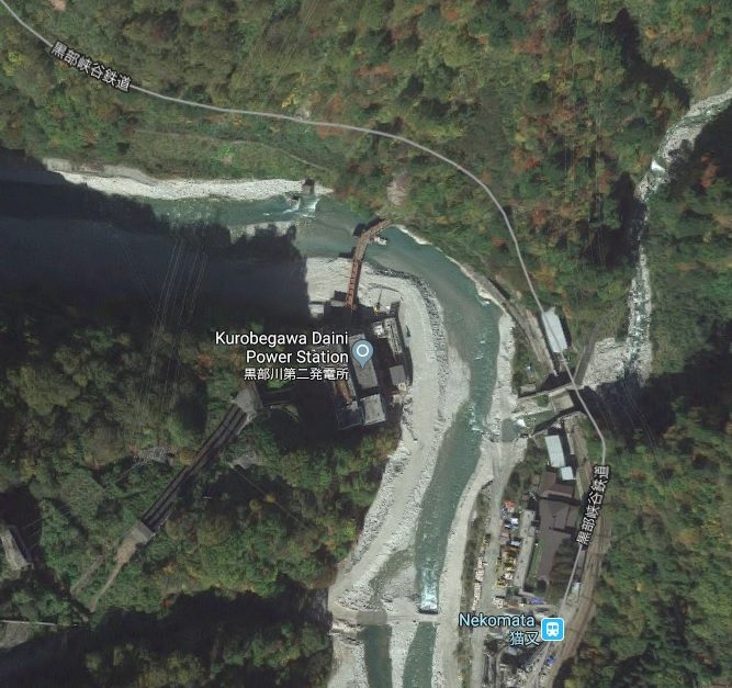 The next significant location on the route is that of the Kurobegawa Daini Power Station. This can be seen below on the West side of the River Kuobe.