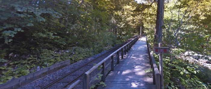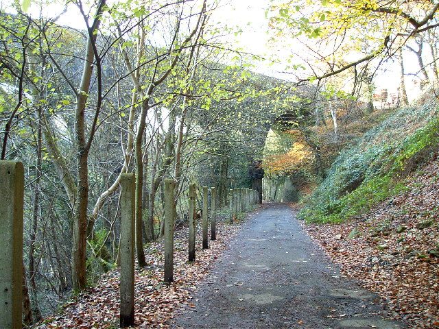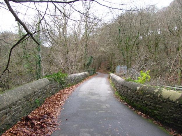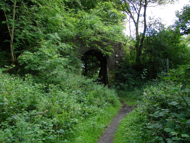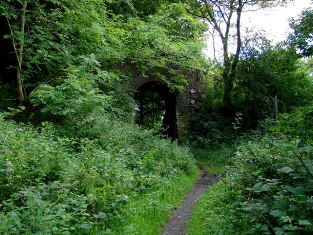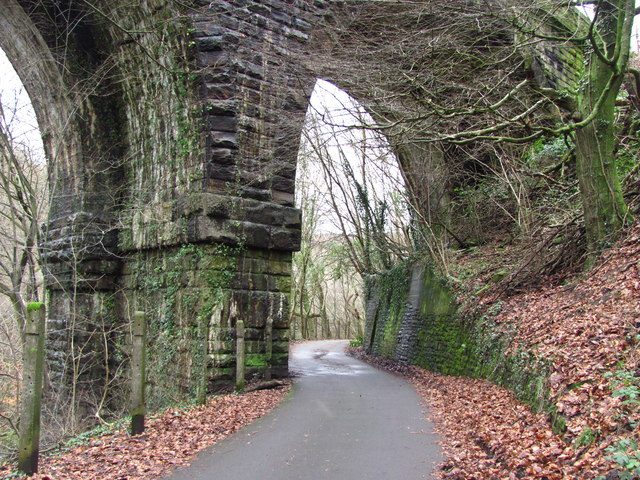 Taff Trail passing under Quaker’s Yard viaduct, the Goitre Coed Viaduct. There is access to Quaker’s Yard train station about 100 metres past the viaduct on a grassy path to the right of the trail – best suited to walkers or mountain bikes, (c) John Light. [7]