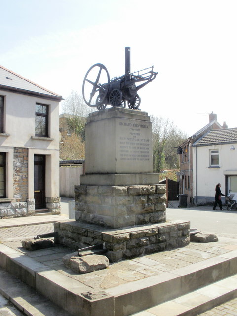 Trevithick Monument, Merthyr Tydfil: The monument is located on the corner of Penydarren Road and Penyard Road.It is a miniature replica of the first steam locomotive to run on rails, built by Richard Trevithick. On its first run in 1804, it traversed the spot on which this monument stands, (c) Jaggery. [29]