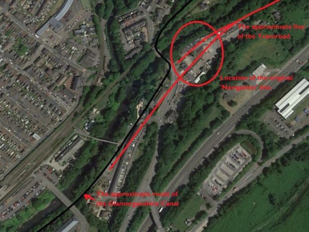 Abercynon on Google Earth, showing the approximate locations of the Glamorganshire canal (black line) and the Merthyr/Penydarren Tramroad (red line) The oval shows the location of the main facilities at ‘Navigation’. In the 1st Century this is now the location of the Fire Station in Abercynon.