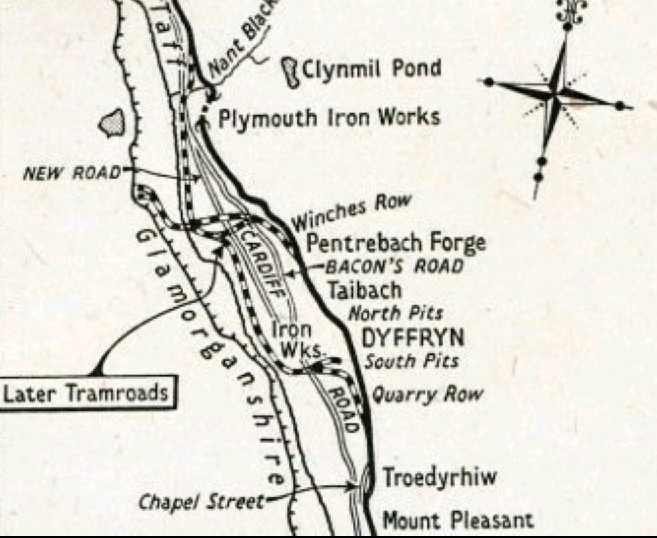 North of Plymouth Works and Nant Cwm Blacks, the tramroad continued along the East side of the River Taff towards Mertyr Tydfil.