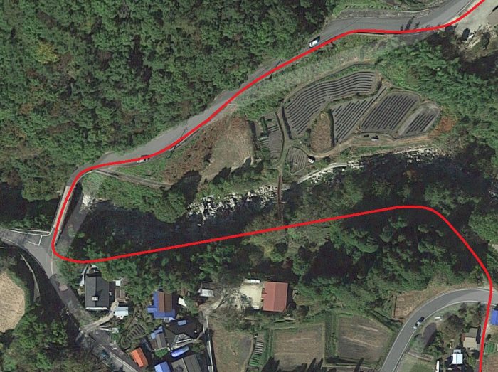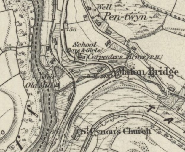 From Navigation to Quakers Yard, the Tramroad has become a single-track road serving a few houses that lie along the route. The line of the old tramway is visible on the 1885 Ordnance Survey Map of the area. A passing loop can be seen on the excerpt below just to the south of the bridge over the Cwm Mafon. Another passing loop is just visible to the top edge of the map.