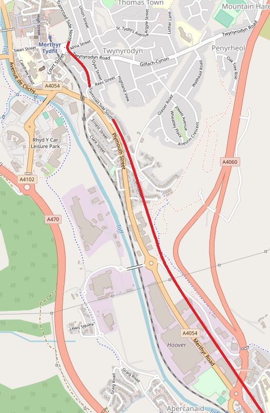he approximate route of the Tramroad into Mertyr Tydfil is shown here. Most of the route is hidden under modern development but the two roads named Tramroad Side South and Tramroad Side North follow the line of the old Tramroad.