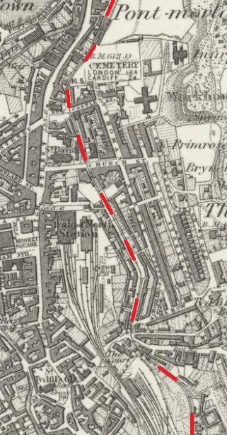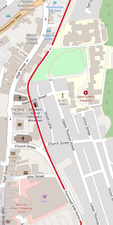 The Penydarren Tramroad passed to the East of the modern terminus of the standard-gauge railway in Merthyr and ran on the East side of the High Street. The road that runs north to Penydarren, behind the former Glove and Shears public house and alongside the Tesco store. [27] The approximate alignment appears on the adjacent OpenStreetMap extract and is shown by a red line.