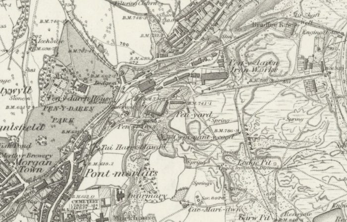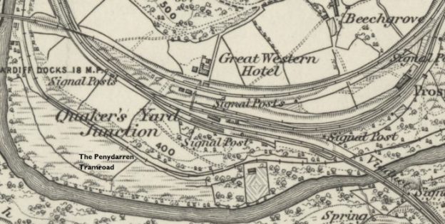 The Glamorgan-Gwent Archeological Trust (GGAT) says of this location: “The Penydarren or Merthyr Tramroad was associated with a complex network of interconnecting tramlines by 1850; this was particularly evident near the Pentrebach Iron Works. The 1878 OS map identified features associated with adjacent workings, Graig, Tai-bach and Wern-las Pits situated along the route, and features associated with the Dyffryn Furnaces, ie the Coke Ovens. While isolated Rows industrial housing with associated yards and allotments, such as Pen-Yard Row, Pencae-bach Cottage, and Winches Row were also a characteristic features of the landscape.” [11]