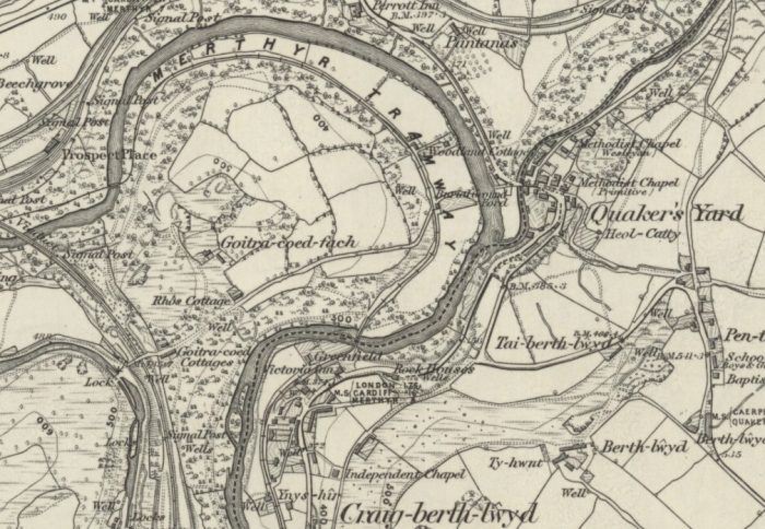 in 1667 the Quakers were given the use of a small piece of land on an estate owned by Mary Chapman. In her will of 1700 this land was subsequently given to the society and on this pasture land the Quakers decided to create a burial ground. The community of Quaker’s Yard began to take shape. Quaker’s Yard was, until the second half of the 19th century, a quiet rural spot. There was a corn mill and a small woollen mill and a small scattering of houses. With its ancient bridge across the Taff the village could even boast two inns, ideal watering holes for weary travellers on their way to and from Cardiff. [8]
