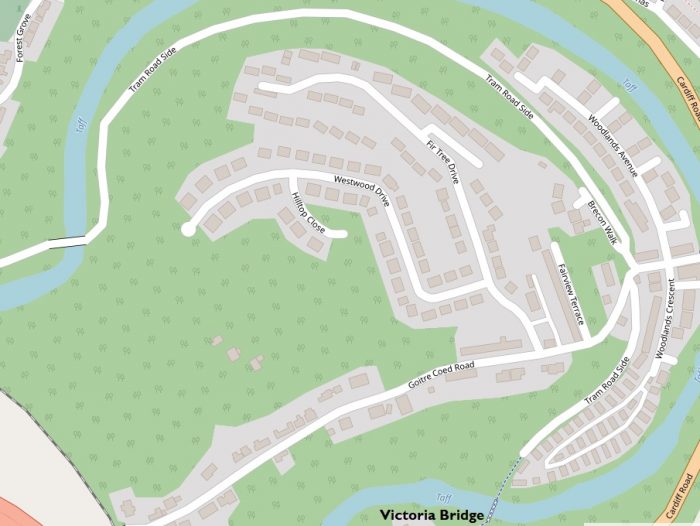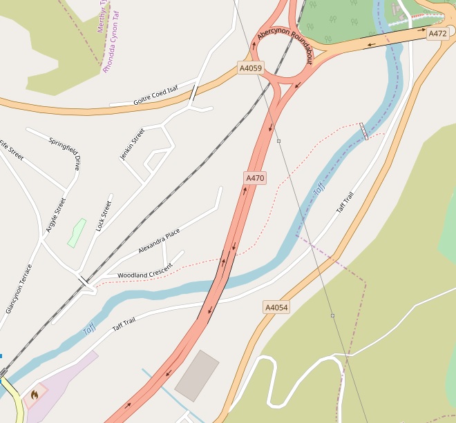 From Abercynon, the tramroad/tramway followed the East bank of the River Taff. There is a ‘road’ following the first part of the route which is marked as the Taff Trail on the OpenStreetMap below.