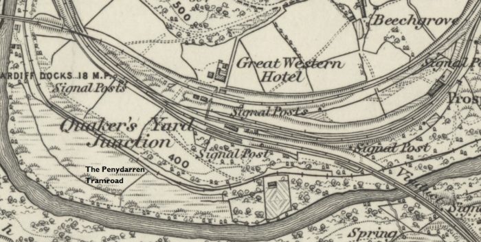 The tramway continued round beyond the viaduct and passed to the South of the Quarker’s Yard Station on the Taff Valley Railway. That station was a relatively important junction station in its time. The OS extract below shows the tramroad. Two passing loops can be picked out to the South of the Railway Station and one further to the East beyond the viaduct.