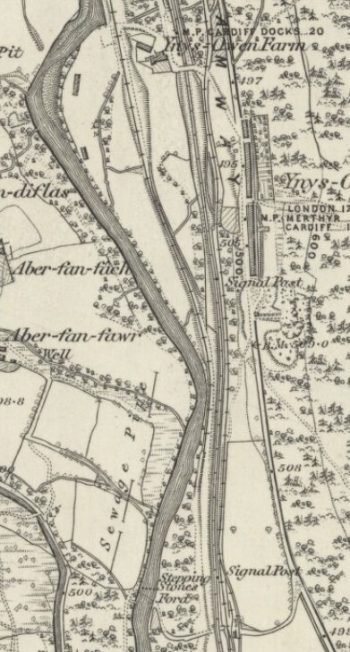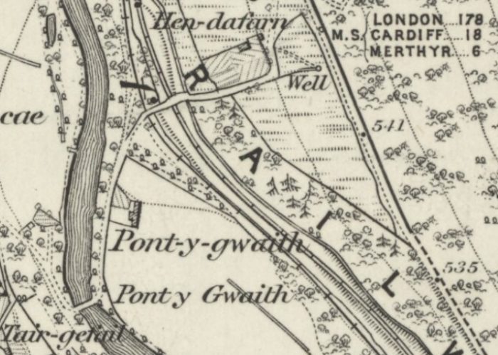At Pont-y-gwaith there was a graceful arch bridge over the River Taff which carried a farm access road. That same road crossed the tramway and later the railway as well. The map extract below shows the location.