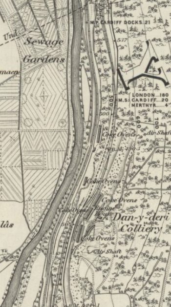 Travelling further North, the line passed Dan-y-Deri Colliery. Thomas Joseph, in partnership with Samuel Thomas opened a level here in 1842. The coal mined at Dan-y-Deri was coked and transported along the Penydarren Tramroad to be used in the Plymouth Ironworks. Long after the tramroad south of Merthyr Vale had fallen into disuse it continued to be used between Dan y-deri and Merthyr. Joseph Thomas was later to open the Duraven Collieries in the Rhondda Valleys, while Samuel Thomas was the father of D. Thomas (Lord Rhondda), founder of the Cambrian Collieries. [20]