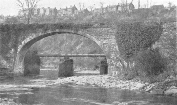 Victoria Bridge, the lower Penydarren Tramroad bridge across the Taff at Quakers Yard. The piers beyond carried a feeder to the Glamorganshire Canal. The arch has now been replaced by a footbridge. [collection T.J. Lodge] [3]