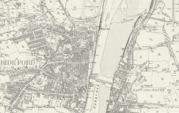 The map extract above shows the town of Bideford. It had been intended to link the two lines serving Bideford. Indeed a locomotive on rails did cross the river here – photographic evidence can be found below! [5][4]