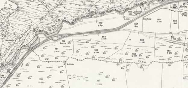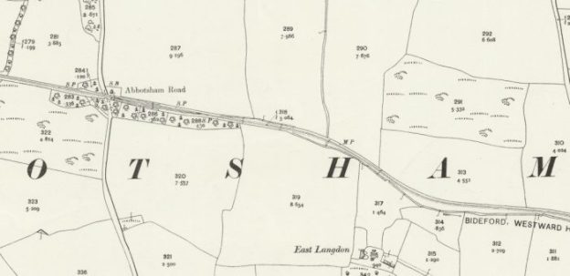 Beyond Abbotsham Road, the old line travelled only a short distance further in a generally westerly direction before turning northwards as highlighed in the two OS Map extracts below. [5]