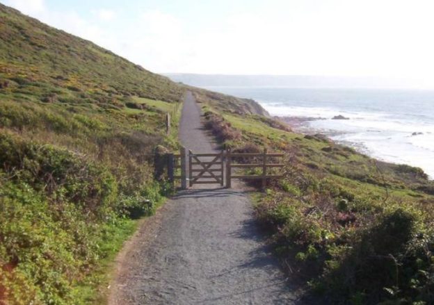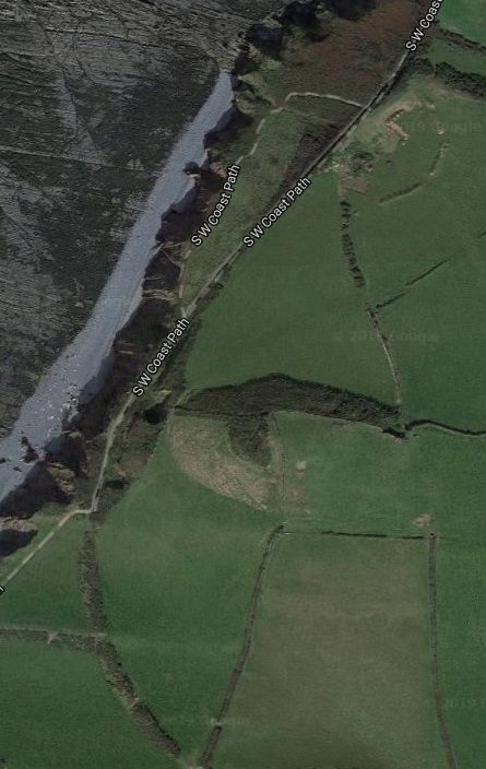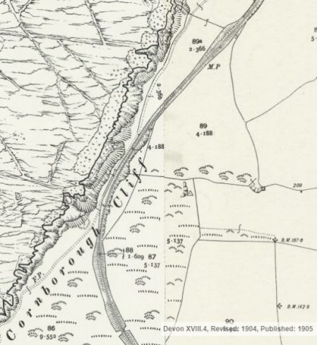 The old line turned North to follow the coast at Cornborough Cliff. The recent satellite image (Google Maps, 2019) shows the South West Coastal Path which joins the formation of the old railway just as it meets the cliffs. From this point it is about 1.5 miles into Westward Ho! The path has been designated for easy access. [20] A few pictures of the footpath/old line follow here and below.