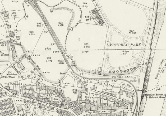 From The Quay, the line turned West and began to climb The Bank with Victoria Park on its right and Pill Road on its left. The old railway formation has become the modern A386, Kingsley Road as can be seen on the extracts from the OS Map and Google Maps below.
