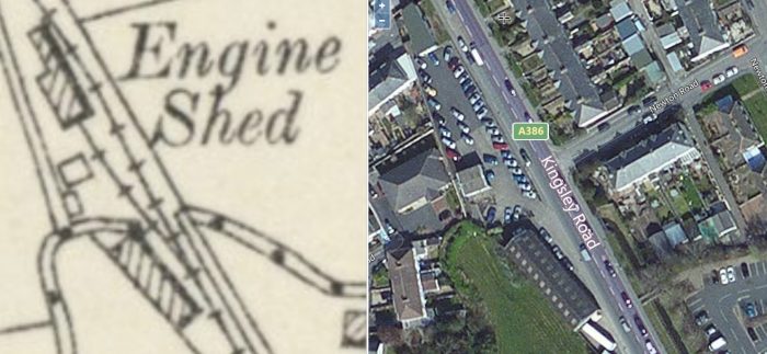 Just to the North of the football ground we find the old carriage shed at a slight angle to the A386. To its North was the Engine Shed. [5]