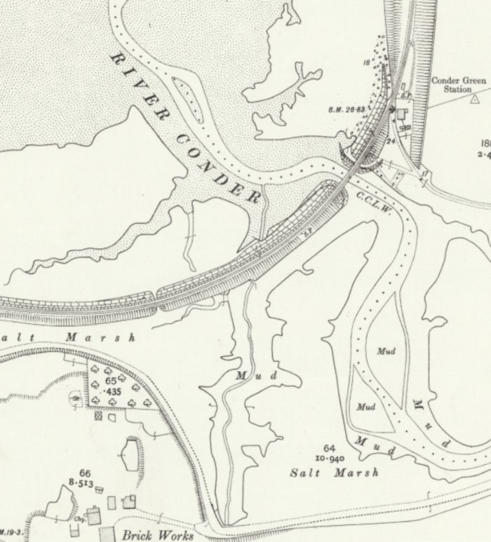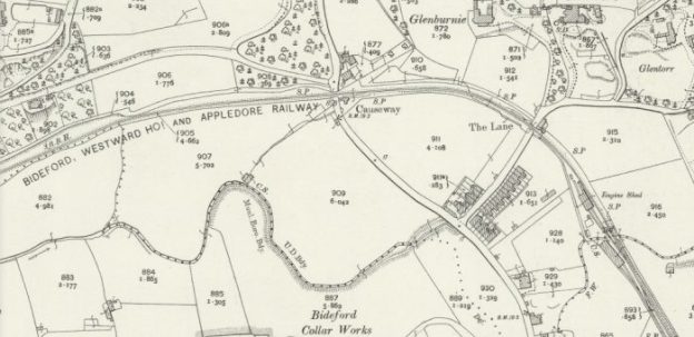 The map extract above shows the town of Bideford. It had been intended to link the two lines serving Bideford. Indeed a locomotive on rails did cross the river here – photographic evidence can be found below! [5][4]