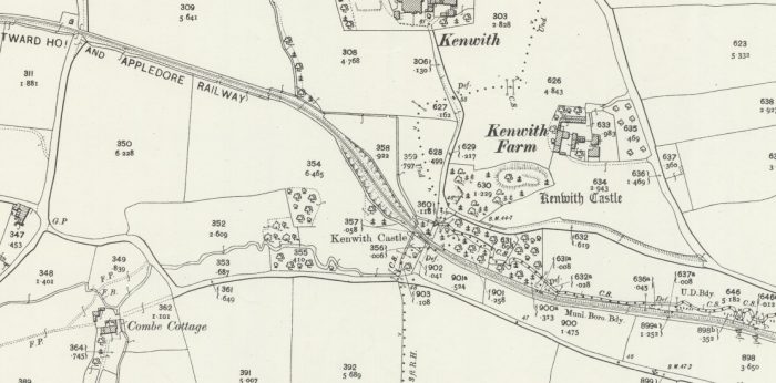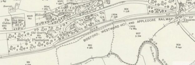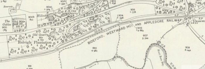 Beyond Abbotsham Road, the old line travelled only a short distance further in a generally westerly direction before turning northwards as highlighed in the two OS Map extracts below. [5]