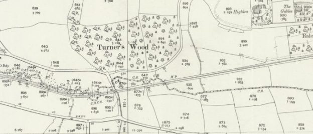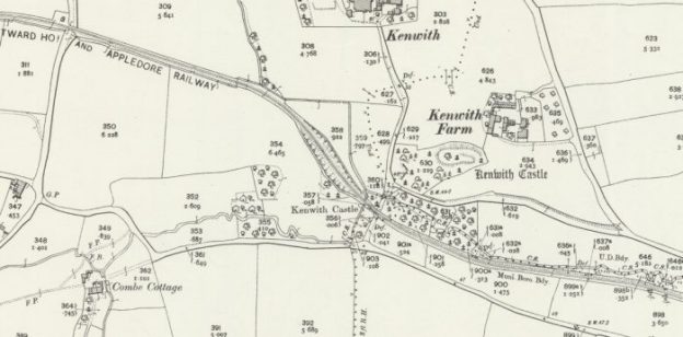 The old line is shown on the modern satellite image above (Google Maps) its route is highlighted by a line of deciduous trees. It continued in a westerly direction travelling to the South of Turner’s Wood and Kenwith Castle as shown on the OS Map extract’s below. [5] South of Turner’s Wood the old line crossed a lane on an over-bridge. The bridge over the stream to the North of the railway line remains but there is no evidence of the railway bridge or embankment at that location. The modern A39, which is prominent on the satellite image above, does not show in any form in the older OS Map extracts.