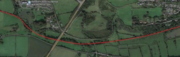 Beyond Kenwith Castle the old line travelled westwards crossing over two lanes/roads by means of over-bridges. The first is on the last OS Map extract above and the location is shown in the first image below (Google Streetview) which is taken from the South of the old line. Again, there is no evidence of the bridge or embankment which carried the old line, nor of the Halt which existed somewhere nearby.