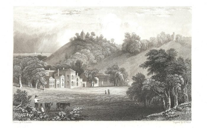 Kenwith Castle is now a Care Home. [17] The Castle was first known as Kenwith Lodge. The mid-eighteenth century building, with an earlier wing, was later used as the dower house of the Pine-Coffin family at nearby Portledge. In 1850 Dr Hevwood was the owner and by 1883 it was occupied by Major General Hickman Thomas Molesworth. The Castellated Regency Gothic front effectively disguises the older building. More recently, the building has been a hotel before being converted into use as a residential home. There is a steel line engraving entitled ‘Kenwith Lodge, North Devon, the seat of W. C. Heywood M.D.’ by H. Wallis after W. H. Bartlett, 1831 and the eighteenth-century gazebo seen in the engraving survives. [18] I believe that the image below is a copy of this engraving. [19]