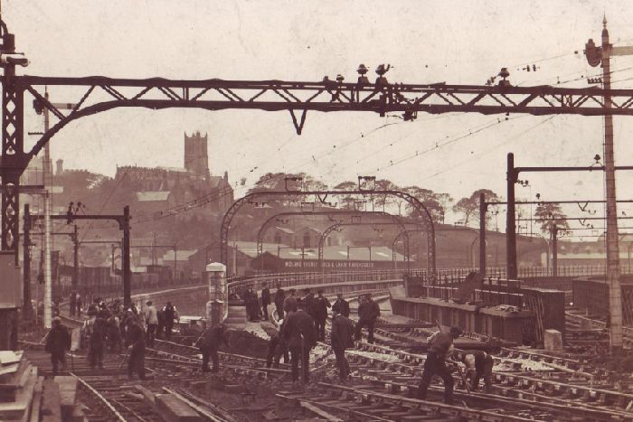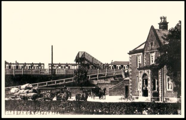 Wkiwand goes on to say: “The station was remodelled in 1900-1906 when additional lines and platforms were added and further station buildings constructed. The new buildings were styled mock-Elizabethan with the intention of mirroring the battlements of the nearby Lancaster Castle. Platforms 5 and 6 (on the east side of the station) were electrified in 1908 to serve the now-closed Midland Railway route to Morecambe and Heysham. This line closed in January 1966 and the overhead line equipment was removed.” [9] The link to the Midland Railway curved to the East down towards the Rive Lune and met the Midland line at Green Ayre Station.