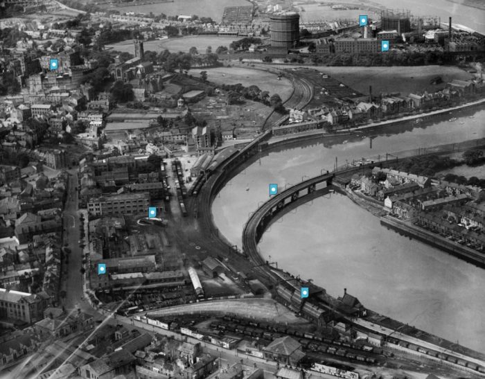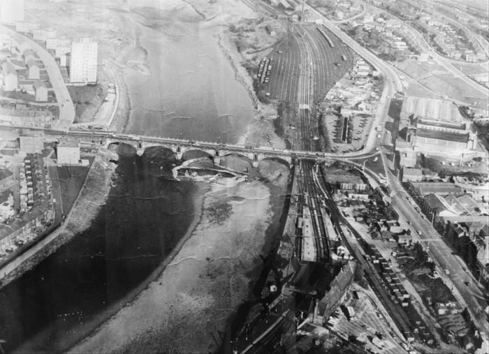 A closer view of Skerton Bridge showing the opening provided for the double track Midland line leaving Green Ayre Station to the Northeast.
