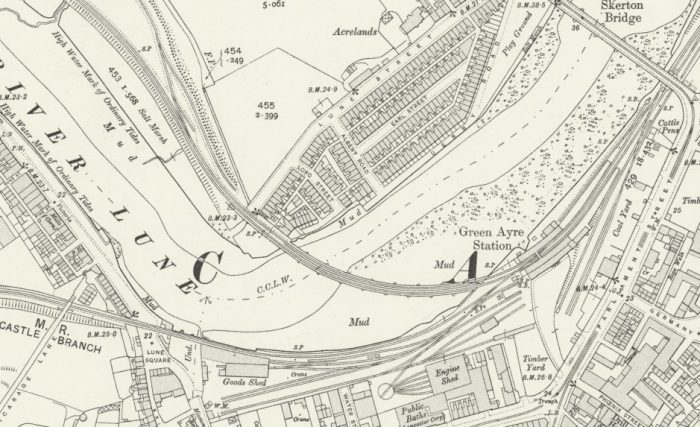 The fantastic aerial image above was taken in 1933. It shows Green Ayre Station at the bottom right with its coal yard across the bottom of the picture. The Greyhound Bridge curves across the River Lune which is at high-water. In the centre of the image is the goods yard with the branch to Lancaster Castle Station curing first to the right along the South bank of the river and then away to the left in front of the highly visible gasometer. Lancaster Castle Station is sited to the left of the parish church beyond the castle buildings. [22]