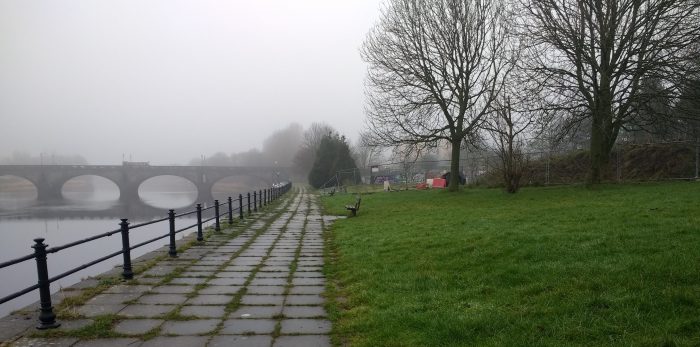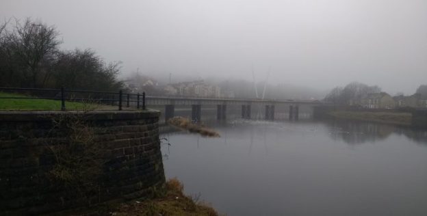 A view along the River Lune from the East of Greyhound Bridge. …. The bridge curves into the old station site from the Northwest.