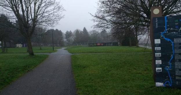 Looking back through the site of the station from a point close to Skerton Bridge. The board visible on the right of the picture gives visitors some idea of what the site was like at different times in its history.