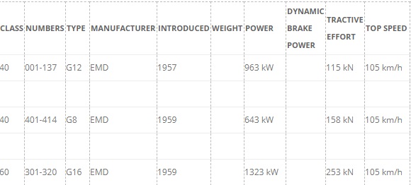 In 1975: 41 No. EMD-G22W Locomotives which were numbered 138-178 in Iranian State Railways Class 40. They were rated at 1103KW with a tractive effort of 116 kN and a top speed of 105 km/hr. [14] A number of pictures of these locomotives are on the http://www.railpictures.net website and on Flickr. These include: