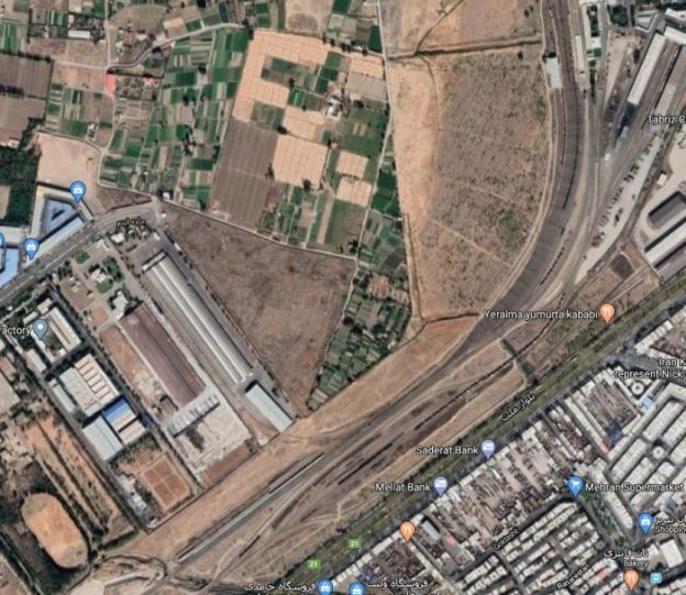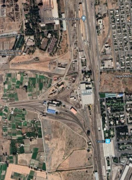 Tabriz to Bazargan: We noted the size of Tabriz in the second articles in this series. [18] Bazargan is a city in Maku County, West Azerbaijan Province, Iran. It is the most important Iranian ground border for importing and exporting. from Turkey In the 2006 census, its population was 9,047, in 2,126 families. [19][20] The railway station in Tabriz in 21st century is shown on the two adjacent satellite images (Google Earth). North of the station is the Railway Maintenance Centre. North of Tabriz the railway line becomes single track. The Railway line can be followed on Google Earth to Sahlan, where a Station serves a special economic zone. Northwest of Sahlan the railway passes under the Marand-Tabriz Road and runs parallel to it for some distance, alternately on its Southwest and Northeast sides and passing through a number of stations on the way.