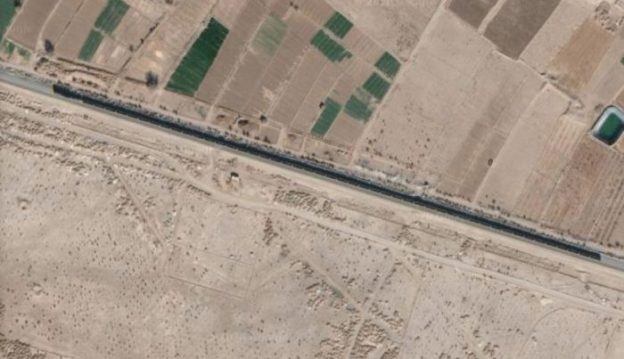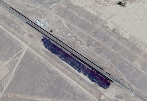 A large mineral train travelling between Zarand and Yazd, captured in the 21st century on the satellite imagery from Google Earth.