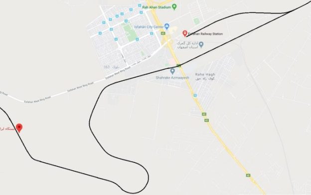 The modern, 21st century, Isfahan Station is some distance (15km) outside the city to the South (Google Earth).