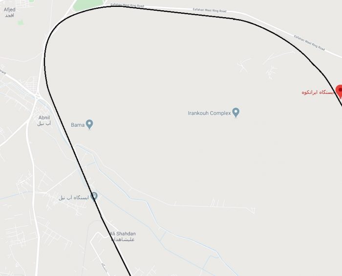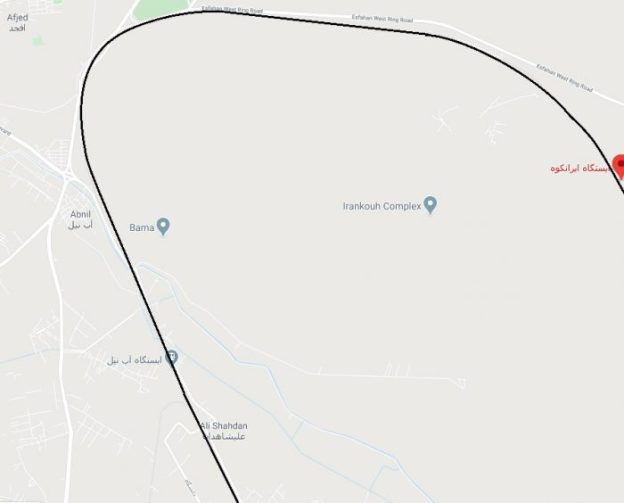 Isfahan Railway Station is shown in the top right of this Google Maps extract. Trains to Zarrin Shahr left travelling East and then reversed to head Southwest. The topography dictated that the line had to loop around in order to allow trains to negotiate significant differences in height. The distance between the two cities by road (along Route 51) is only 47km. The railway is 11km in length!
