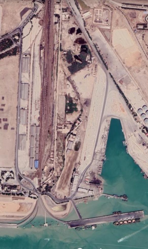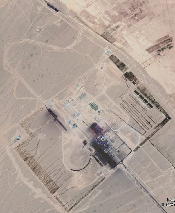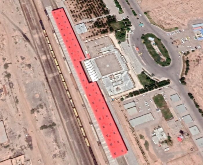 These appear to be either coal of iron ore sidings parallel to the main line between Zarand and Kerman. The strong black lines visible on the satellite image are long trains of open wagons in what appear to be exchange sidings (Google Earth).