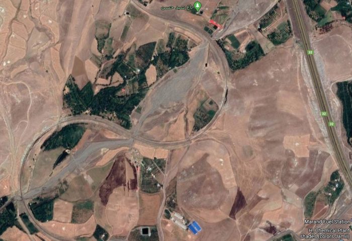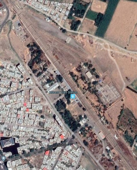 The railway then runs round the Eastern outskirts of the city of Marand to its railway station, sown on the adjacent satellite image. It then passes under the Marand-Hadishahr Road and parallel to the Marand-Jolfa Road. The line continues all the way to Jolfa and the border with Armenia and Azerbaijan.