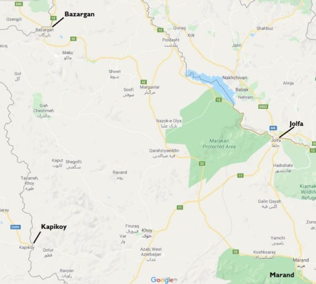 I have followed both the lines above on Google Earth and looked at various online resources and cannot identify the route of a line between Tabriz and Bazargan. I am not sure, therefore which of these two routes the Wikipedia article relates to. The relative locations of the cities concerned are shown on the Google Maps extract below.