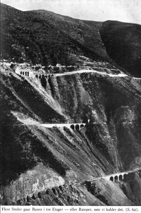 “The first thing we did when the Contract was confirmed was to take over the work underway in the north and south, and it wasn’t long before around six thousand men were at work. The next step was to determine the alignment of the remainder of the line – around 1000km. On the Iranian plateau, this task was not very complicated, but in two places the line would pass through such difficult terrain hardly ever encountered by railways elsewhere in the world. One place is on the Northern Line – the Elbruz mountain range. It extends in a west-easterly direction, parallel to the Caspian Sea coast. You can’t get around it, you have to go through it. The ascent from the flat coastal country up to the high mountain pass (over 2000m above sea-level) is so steep that the route has to chosen very carefully – but you must go to the Northern Line with Karl Olsen one of these days, then he will show you what I mean. I cannot describe it adequately.