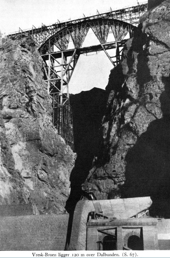 “… The bridge is 120 metres above the valley floor, and its length is 86 m. Like most of the bridges up here, it is made up of cast cement blocks – it gives greater elasticity than reinforced concrete, something that has significance in a terrain like this, where earthquakes occur quite frequently. On 29th July 1934, we had a terrible experience while working here in the Vresk Gorge. The line curves away from Abbasabad Station and enters a turning tunnel that ends just before the ravine, in the bottom of which runs a small innocent looking stream. when planning the project, we had expected a lower bridge that would take the railway across the creek to a tunnel on the other side, through which the line would continue along a long detour to the north and through a new turning tunnel to climb the 120 m up to the Vresk bridge.”
