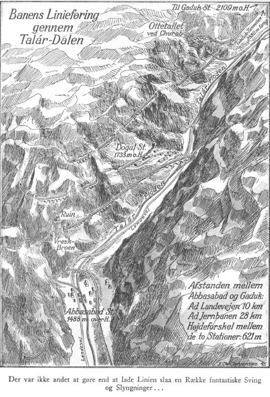“I must correct you now,” replied Karl Olsen. “Kampsax did not have the responsibility for the station signs. These have been set up by the Iranian Railways themselves. However, it would be incorrect to designate the Station here as the Northern Line’s highest point. It is inside the mountain ahead. The tunnel, which starts just north of the Station, is 2880 m long, From the far end, the profile of the tunnel is not a straight line – at some point the ascent is interrupted, and the line begins to descend towards the station here and then further down onto the high plateau. The highest point is 1300 m from the tunnel opening. You can see the opening ahead.”