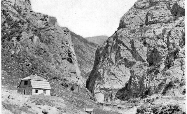 The goods shed at Dackatsu station on the Mianch-Tebriz line. In the background is the station house. All buildings are built in stone. [1]