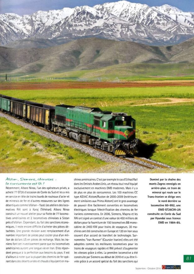 During the years of economic sanctions, it became increasingly difficult to obtain these good old, reliable and durable diesels. Other manufacturers took the opportunity to deliver their locomotives. But as good as the products of Siemens or Alstom/Ruston, the American classics were highly appreciated for their robustness (and even “indestructibility”!), Their reliability, their ease of maintenance, their high load-pulling capacity and even their ease in digesting fuels of variable quality. You can power an EMD or GE engine with anything that smells near enough to the smell of diesel, even heavy fuel oil is acceptable and does not stop the engine. The indifference to both the quality of the fuel and the harsh climatic conditions are advantages that the new highly efficient diesel engines will never achieve. This is why, despite the arrival of a lot of new locomotives in recent years, the good old GF26CWs will not disappear anytime soon. These machines are still at the heart of the locomotive depot on some of the most difficult parts of the network, notably the Trans-Iranian Railway.