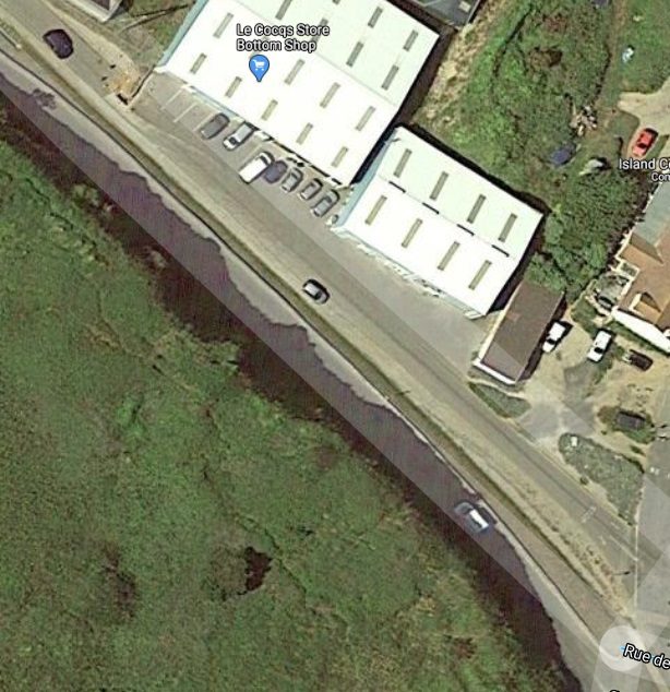 The view Southwest along the breakwater towards Fort Grosnez (Google Maps). The old breakwater railway can just be picked out running from the bottom right towards the fort.