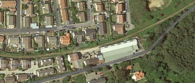 The line from the breakwater enters on the right of this picture. The station building at Braye Road Station is the timber shed to the left of centre. (Google Streetview).