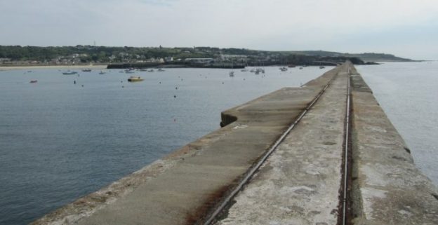 The old railway was in use out onto the breakwater. It can still be seen on satellite images. A short stub siding ran in the yard in the bottom left of this image. The route to Mannez Quarry curved South from the breakwater, (Google Earth).